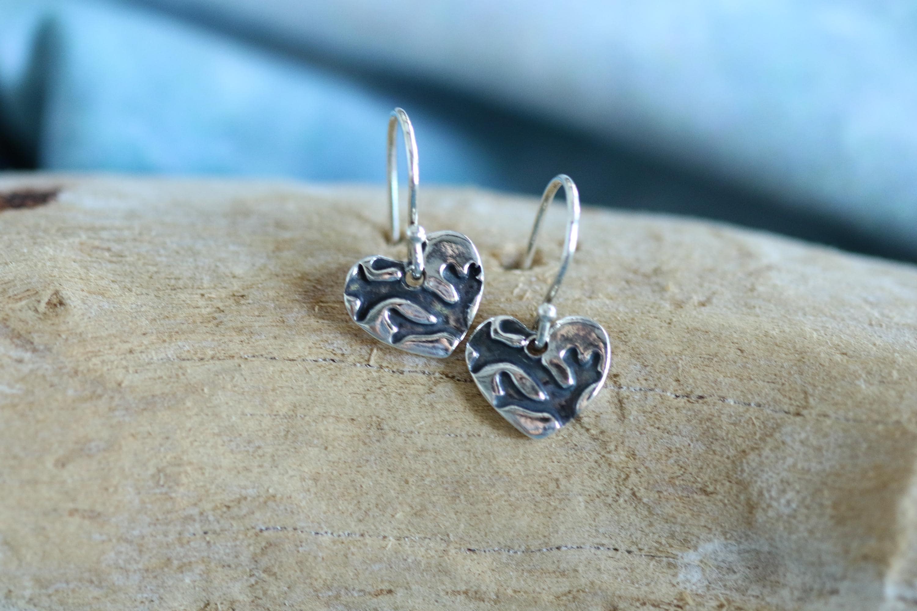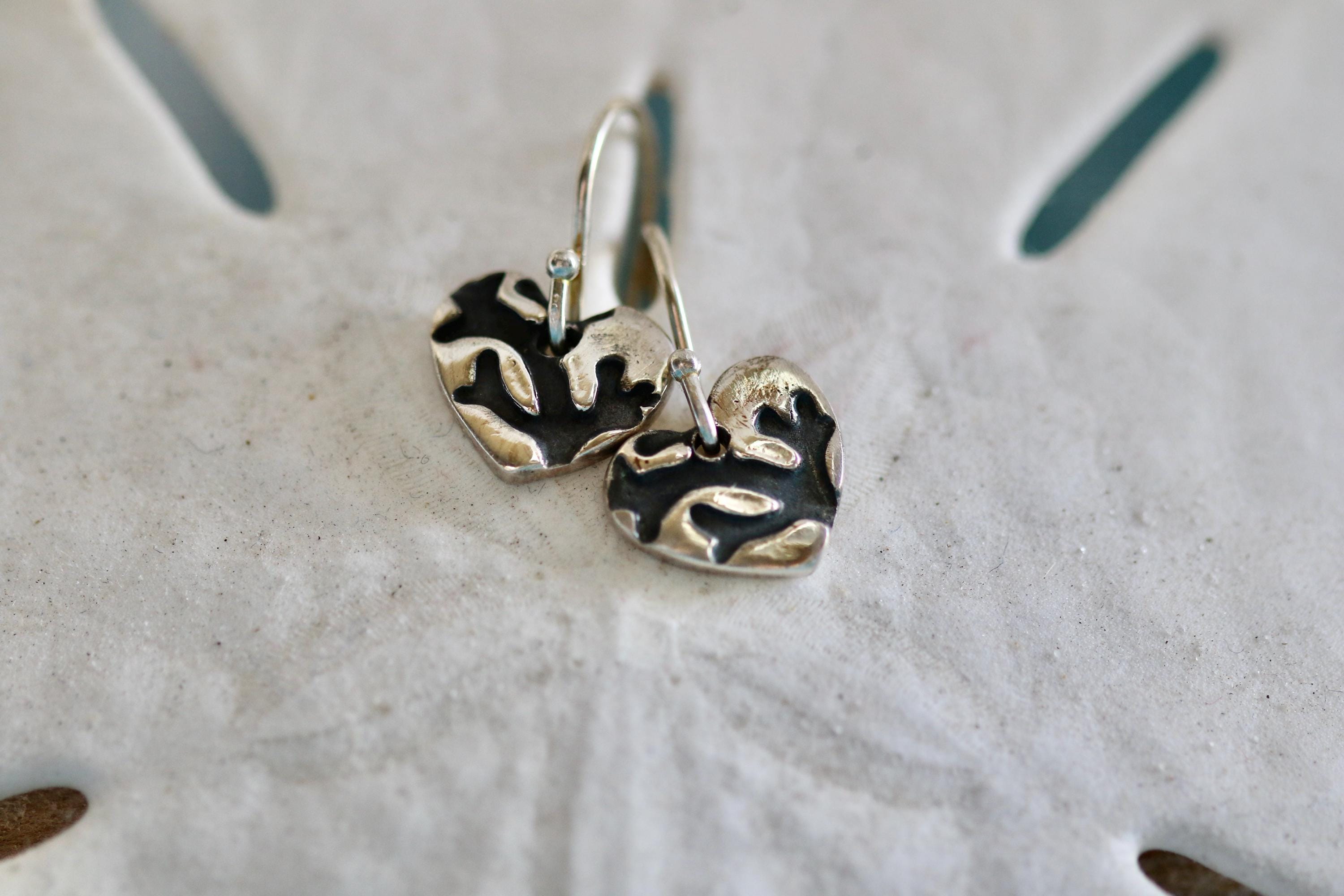 These artisanal earrings are handcrafted from precious metal clay, kiln-fired into solid sterling silver for lasting beauty. The heart-shaped design features a coral-inspired imprint, enhanced with an antiqued finish that highlights the organic texture. Lightweight, unique, and ocean-inspired, these earrings capture the elegance of natural coral in a timeless sterling silver form—perfect for anyone who loves handcrafted coastal jewelry