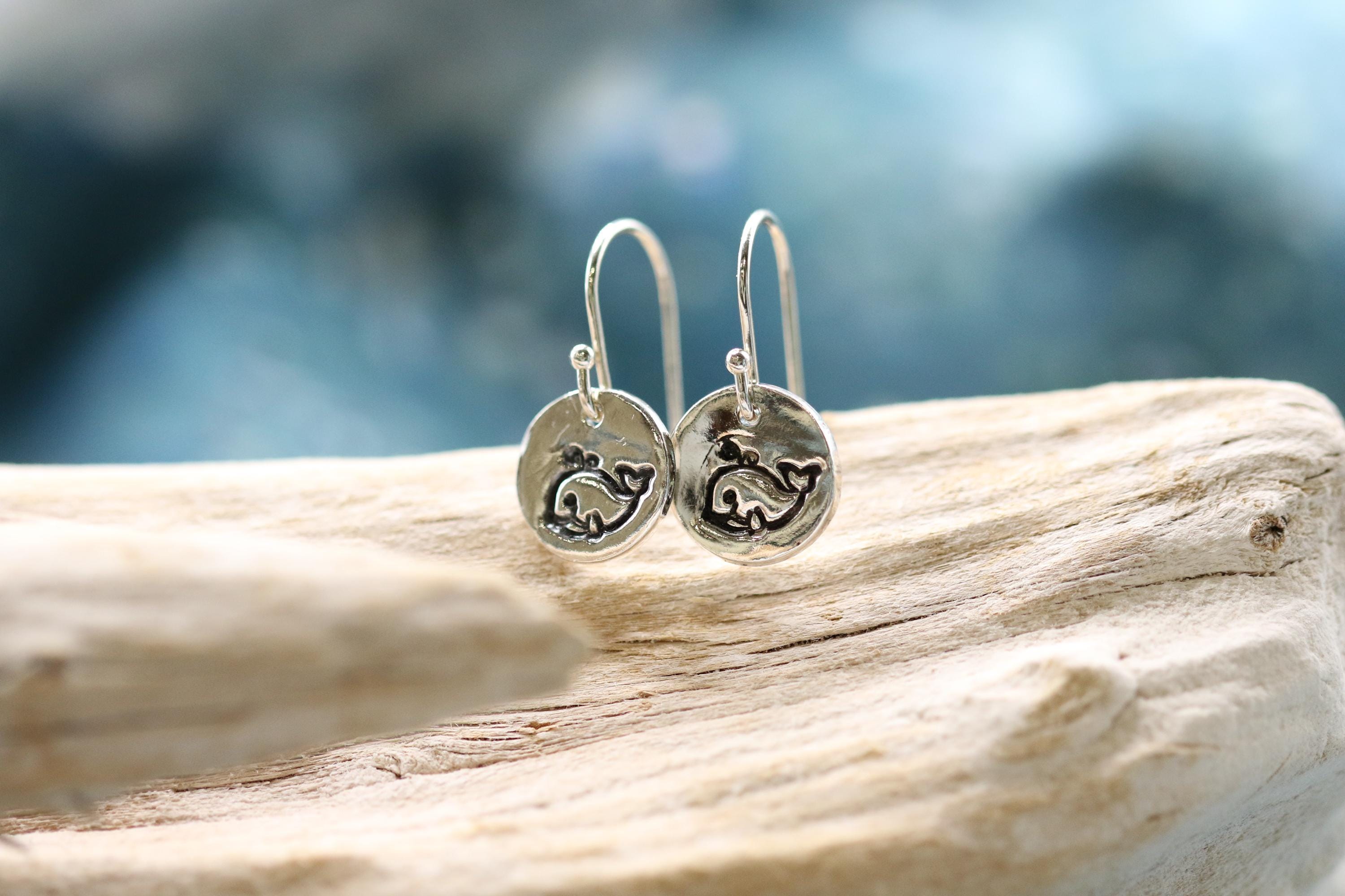 These adorable whimsical whale earrings are handmade from fine silver clay, with the stamped whale, then lightly antiqued black to make the impression more noticeable. They're a 12mm round disk, with a sterling silver wire hook and plastic guard to prevent falling out.